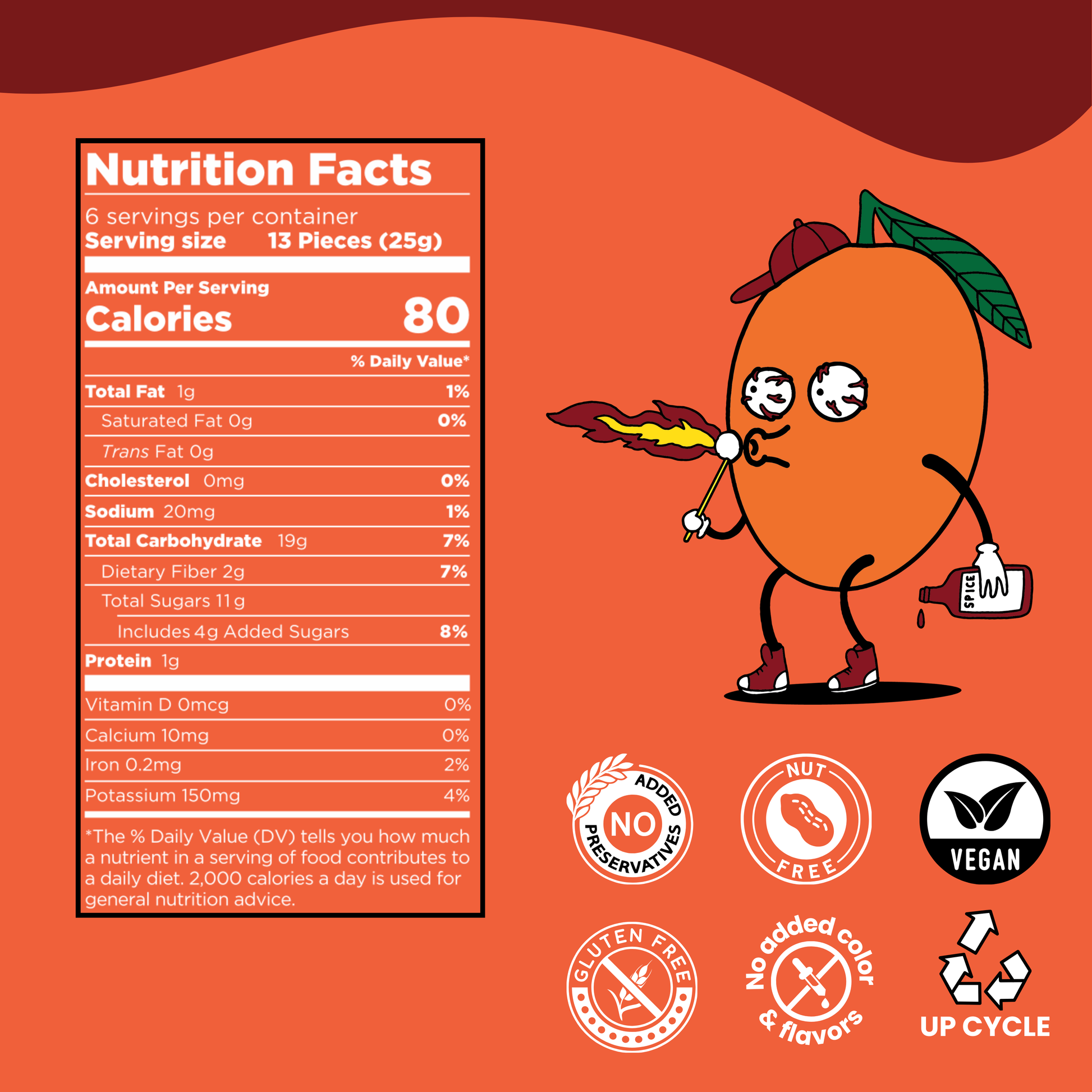 Tropical adventure with a twist. Natural mango sweetness harmonizing with a playful kick of chili heat! These 100% natural fruit snacks made with care and tradition. It contains no added colors, flavors, or artificial preservatives, ensuring a pure and wholesome treat with every bite. Taste the difference of nature's best, straight from the orchard to you!